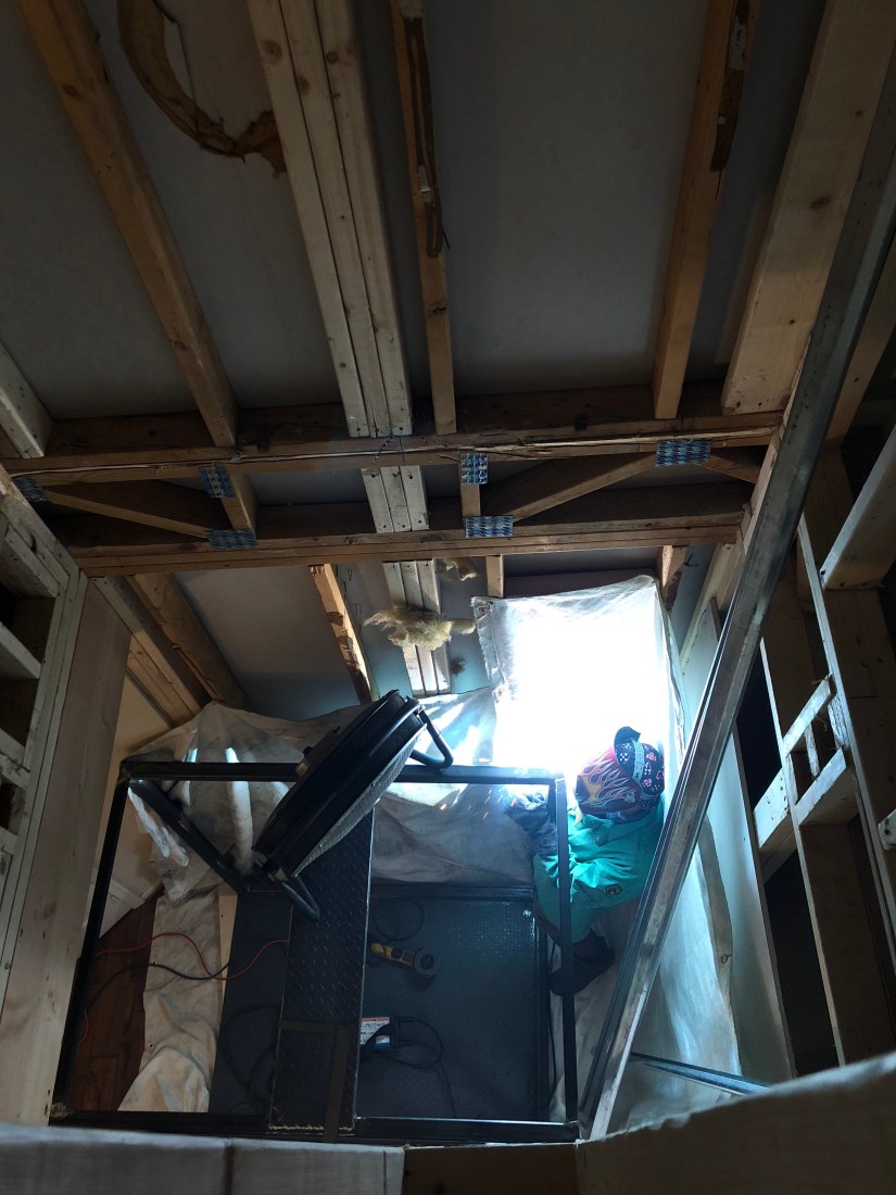 After the shaft for the elevator was built, which is in part 1, they started working on the lift itself. This is not your run of the mill elevator platform that requires all sorts of weird stuff! This is custom! And, if I may say so, Carolyn, that is high praise from Neil, who builds beautiful custom homes!!!